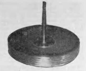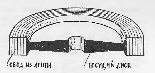 Безопасный высокоэнергоемкий маховик, навитый и склеенный из тонной стальной ленты; схема вверху поясняет конструкцию такого маховика: на легкий и прочный несущий диск навивается со склейкой тонкая стальная пружинная лента.
