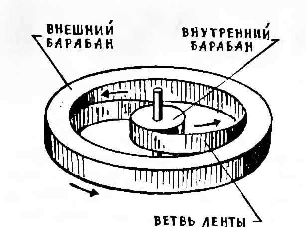 Вращаясь достаточно быстро, ветви ленты (при известном их количестве) создадут такой крутящий момент на внутреннем барабане, какой только может потребоваться. При превышении его, например, при подъемах, разгонах, никаких поломок не возникает: внутренний барабан замедляется и слегка отстает от внешнего; лента навивается на него и создает все возрастающий крутящий момент, который необходим, чтобы преодолеть препятствие.