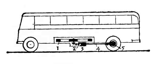 Так схематически можно представить один из вариантов маховичного автобуса: маховик 1 с «мягкой» характеристикой заряряжается на конечных станциях через вал зарядки 2, выходящий из коробки передач 3 которая связана карданным валом 4 с главной передачей 5 (как и на обычных автобусах).