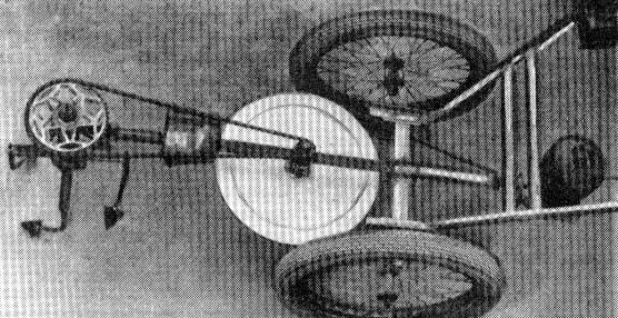 Лет семь назад изготовил я электромотыгу. Двигатель мощностью 1 кВт, трехфазный, питание 220 В, 2 850 об/мин, работает с конденсаторами. В принципе, однако, для мотыги может подойти любой электродвигатель. Колеса взял от тележки (продается в магазине за 38 рублей). Штанга, на которой крепится двигатель, ось колес, промежуточный шкив и рабочий орган — труба 3/4 дюйма. Первая передача от двигателя к промежуточному шкиву — ременная. Вторая — велосипедная цепь.