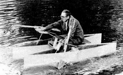 Несколько несложных манипуляций, и «чемодан» распался на четыре клиновидных поплавка. Если клинья теперь соединить попарно, а получившиеся лодочки связать поперечиной, выйдет катамаран — самое лаконичное из флотилии миниатюрных суденышек, которыми В. А. Вакуленко — судостроитель с 40-летним стажем уже снабдил любителей отдыха на воде.
