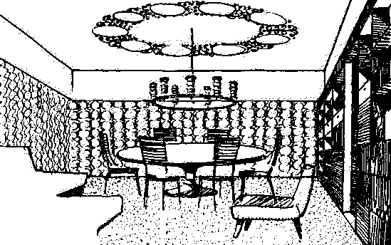 Рис. 2. Гостиная столовая с большим круглым столом по центру (таков был классический прием в больших комнатах), над столом на потолке большая декоративная розетка, выклеенная из отдельных элементов обоев или ткани. Мотивы таких розеток могут быть весьма разнообразными в зависимости от выбранного вами рисунка ткани, а также от общего убранства комнаты. Диаметр розетки связан с площадью комнаты и может колебаться и пределах от 140 до 220 см и более. Периметр стен под потолком подчеркнут багетом — темным или под золото. Люстра здесь должна быть большого диаметра. простой формы с тонким кольцом- Такую люстру можно изготовить самому. Главное для нее — стеклянные или пластмассовые «стаканы», которые продаются ч специализированных магазинах «Свет» Обруч — из подручных материалов: трубка, металлн ческая полоска на ребро и пр.