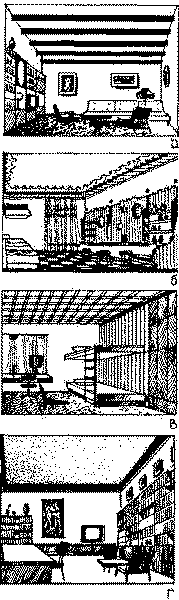 а — потолок гостиной с темными балочками и светлым фоном Стены также светлые. Этот прием, основанный на контрасте, имеет данние традиции 11 архитектуре разных стран;