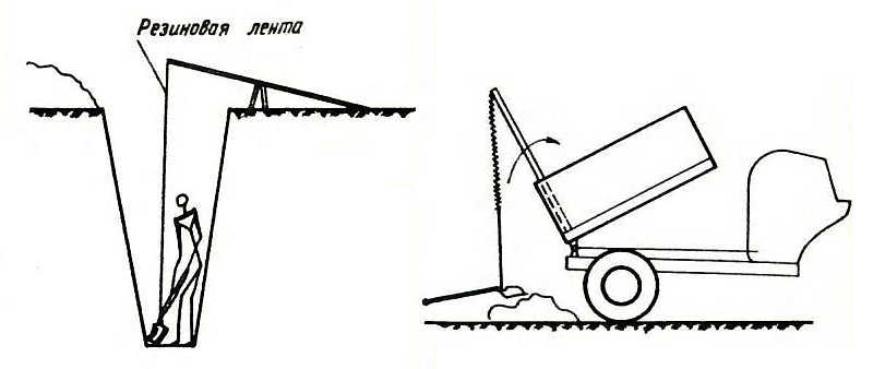 Читатель из Ангарска В. Климович предлагает снабдить обычную лопату упругой резиновой лентой. Если один конец ленты привязать к лопате, а другой к шесту, установленному на борту кузова, к вспомогательному трамплину или ферме, работать будет легче. Правда, прежде резину надо растянуть, но с пустой лопатой это менее утомительно, чем без приспособления бросать груз в кузов.