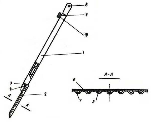 7 — нижний слой; 8 — ручка: 9 — заливное отверстие с пробкой; 10 — штуцер к шлангу.Постепенно стекая вниз, жидкость расходится, просачиваясь через пористый верхний слой, смачивает его, и почва не прилипает. Та же лопата, если понадобится, может самоохлаждаться или подогреваться, дезинфицировать почву или погрузочный материал, вводить в них добавки. Если условия позволяют, заправочный шланг можно не отсоединять и подавать жидкость в лопату непрерывно.