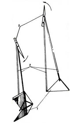 Лопата системы Кухтикова: 1 — совок из листа железа; 2 - ручки из дерева; 3 — рычаг.Кухтиков четыре ямы таких же размеров роет своей лопатой всего за 3—4 часа. Да какие ямы — размер в размер. И не то что в яму не прыгал, даже с места не сходил.