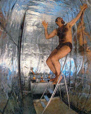 И я, и мои друзья легко выносят получасовое и более непрерывное пребывание в сауне. Одного-двух заходов, общей продолжительностью до часа, бывает достаточно для потери 2—2,5 кг веса. Между заходами принимаю, как обычно, холодный душ или ванну. Для усиления теплового воздействия усаживаюсь в сиденье на стремянке на высоте 1,5 м. Стремянка, как и фольгированные стены сауны, на ощупь холодна — они отражают тепло. Греется все, что не покрыто зеркальным слоем, а это — мы сами.
