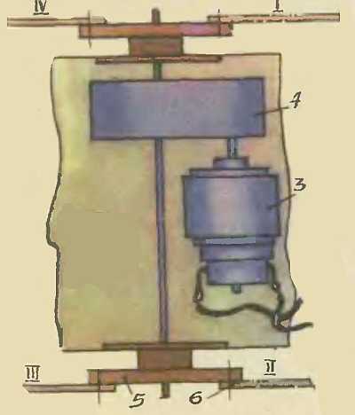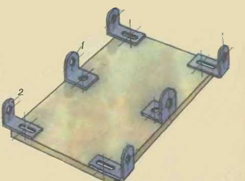 Монтаж начните с установки на несущей раме (рис. 2) микродвигателя с редуктором. Расположить их необходимо так, чтобы вал редуктора проходил над центром пластины. Наденьте на вал редуктора центральные скобы 1 и закрепите их так, чтобы не выступали головки винтов с гайками. Крайние скобы 2 делаются несколько большего размера с проточкой под винт, чтобы регулировать выступ скобы над торцевой поверхностью рамы. Шарнирные оси центральных и боковых скоб должны располагаться на одной горизонтали (см. рис. 4).