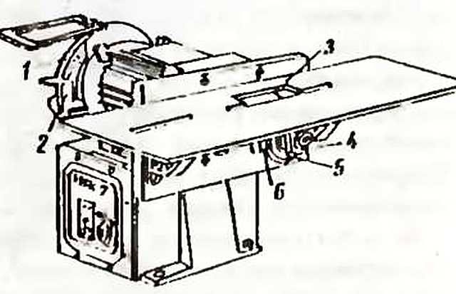Деревообрабатывающий станок имеет несколько приставок — фуговальную 1, круглопильную 3, угломерную 4, фрезерную 5, сверлильно-пазовальную 6 и заточное устройство 2.