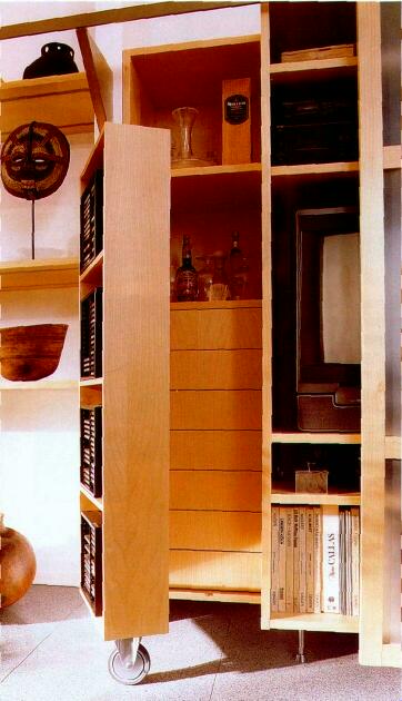Стенка в гостиной легко трансформируется благодаря раздвижным панелям с декоративными рамами из берёзы и вставками из матового стекла. Раздвижная конструкция стенки позволяет при необходимости закрыть всё содержимое, оставив только аппаратуру. Одна из секций стенки имеет поворотные ролики, которые придают дополнительное удобство в размещении необходимых вещей
