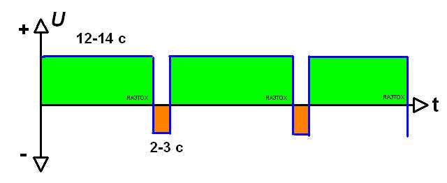 Способ признан изобретением (а. с. № 372599). Зарядка аккумулятора производится асимметричным током: соотношение прямого и обратного токов — 10:1, отношение времени протекания импульсов тока в прямом и обратном направлении 1:2.