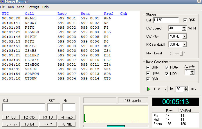 Прошло три месяца и две недели. Мы уже достаточно хорошо умеем принимать как смысловой текст, обычную человеческую речь, только буквами, так и радиограммы - шифровки в которых все символы разбиты по пять знаков в группе, по десять групп в строке ну и количество строк по длинне "шифровки". В нашем радиолюбительском деле это почти никогда не понадобится, исключение WAE Contest, да и там QTC - это предыдущие несколько связей. Но вот вам пришла в голову мысль поработать в соревнованиях. И опять тактика подготовки меняется. Нам снова нужен другой тренер. На этот раз это будет программа Алекса Шовкопляса (похоже корни наши :-) VE3NEA. http://www.dxatlas.com/morserunner Спасибо ему за замечательный софт - программа-ягодка. Не секрет, что лидер в контест логгерах N1MM, TR4W и подобные. Везде макросы приводят к одному стандарту. Не исключение, а вернее следствие этого - макросы MorseRunner. Короче, работаете себе в соревнованиях на 100% эмуляторе N1MM (TR4W) без трансивера, но ощущение 100% достоверные. Интерфейс программы совершенно прозрачный, но на всякий случай я уточню для тех у кого проблемы с английским.