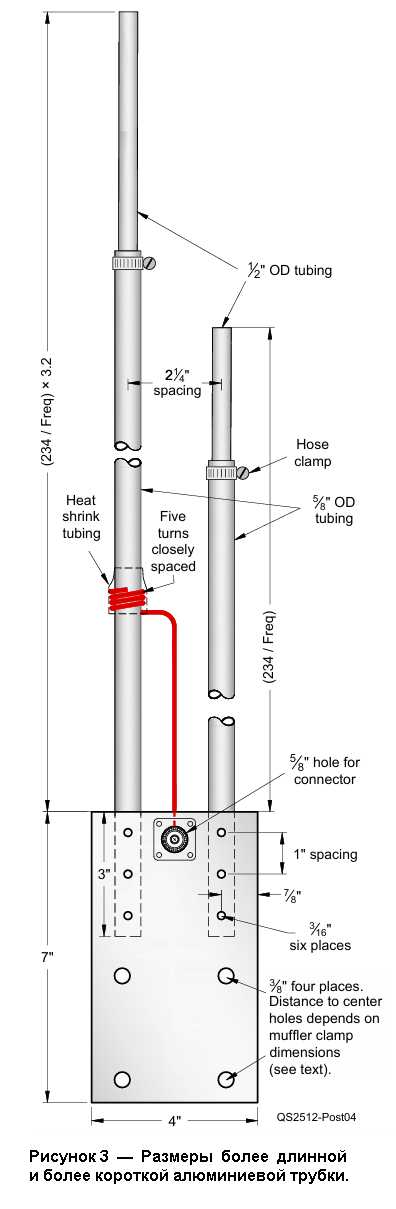 После обрезки трубок наружным диаметром 5/8 дюйма (15,6 мм) до нужной длины, сделайте прорезь на одном конце каждой трубки, чтобы облегчить крепление секции диаметром 5/8 дюйма (15,6 мм) к секции диаметром 1/2 дюйма (12,5 мм); эти прорези будут направлены к верхней части антенны. Затем просверлите шесть отверстий для крепления пластины к трубке, согласно чертежам монтажной пластины (см. Рисунок 3).