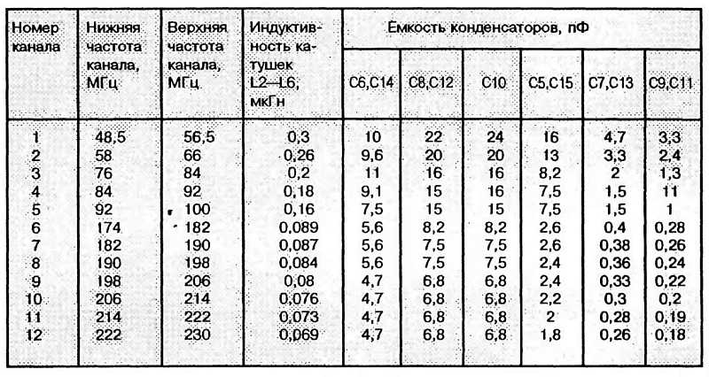 Диоды VD1, VD2 усилителя защищают входной каскад от возможных мощных электрических разрядов, например во время грозы. Катушка L1 подавляет сигналы на частотах менее 40 МГц. Цепь C4R5 выравнивает усиление в интервале рабочих частот. Канальный фильтр должен обеспечивать хорошее подавление сигналов соседних каналов приема, поэтому он выбран пяти контурным. Расчетная полоса пропускания — 8 МГц, но может быть 8...10 МГц. Номиналы элементов фильтра для всех каналов диапазона MB указаны в таблице. Следовательно, можно адаптировать усилитель к конкретным условиям приема, т.е. установить в нем фильтр, настроенный на самый слабый принимаемый сигнал. Нагрузочные сопротивления всех фильтров — 75 Ом.