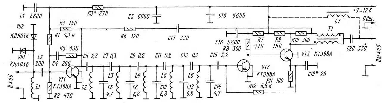 В устройстве, кроме указанных на схеме, можно применить малошумящий транзистор КТ399А (VT1 — VT3) и серии КТ316 (VT2, VT3), диоды КД522Б, КД521А. Резисторы — МЯТ, конденсаторы емкостью от 2 до 20 пФ— КД, КТ, а емкостью более 20 пФ —КМ, КЛС.
