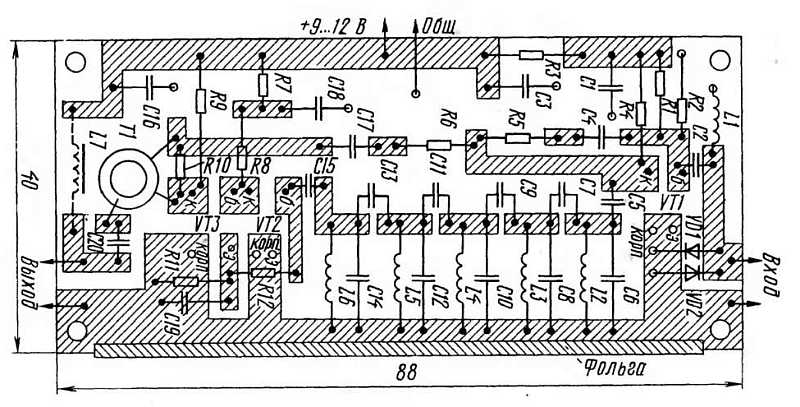 Все детали усилителя размещены на печатной плате из двустороннего фольгированного стеклотекстолита толщиной 1,5 мм, рисунок проводников которой изображен на рис. 3. Печатные проводники сделаны на одной стороне, а вторая оставлена металлизированной и использована как общий провод, к которому через отверстия в плате припаяны выводы некоторых деталей. Кроме того, через край платы эта сторона соединена припаянной фольгой с общим проводом усилителя на другой стороне.