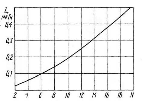 Катушка L1 намотана на оправке диаметром 6 мм и содержит 3...4 витка провода ПЭВ-2 0,6. Катушки канального фильтра L2 — L6 — бескаркасные, их наматывают на оправке диаметром 3,5 мм проводом ПЭВ-2 0,4, число витков в зависимости от требуемой индуктивности определяют по графику на рис. 4.