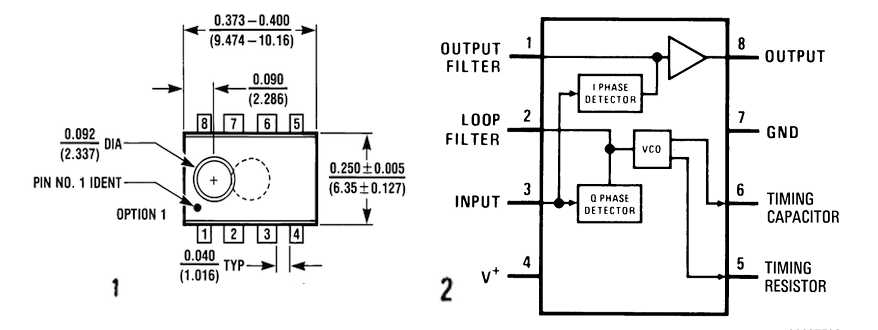 Это недорогой продукт типа 567 в 8-контактном корпусе DIP. На рисунке 1 показана схема расположения выводов этого корпуса. На рисунке 2 показана внутренняя блок-схема этого устройства. Как видно, основными компонентами NE567 являются фазовая автоподстройка частоты, ортогональный фазовый детектор, усилитель и выходной транзистор. Фазовая автоподстройка частоты содержит управляемый током генератор (CC0), фазовый детектор и фильтр обратной связи.