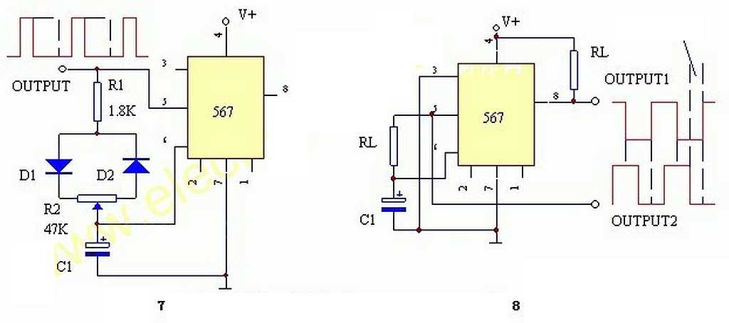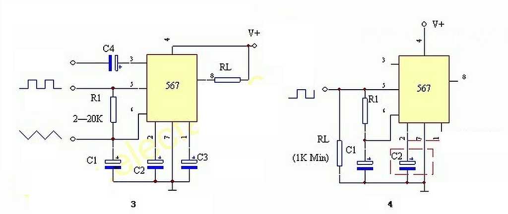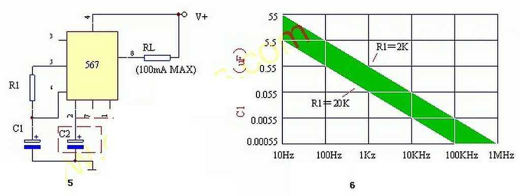 Например, если вам нужно, чтобы этот генератор 567 работал на частоте 10 кГц, значения C1 и R1 могут быть равны 0,055 мкФ и 2 кОм или 0,0055 мкФ и 20 кОм.