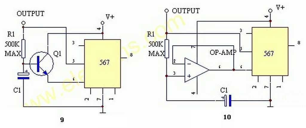 На рис. 9 и 10 показаны схемы генераторов с номиналами резисторов синхронизации до примерно 500 кОм. Таким образом, значение конденсатора синхронизации C1 можно пропорционально уменьшить. В обеих схемах между выводом 6 микросхемы 567 и узлом R1 и C1 имеется буферный каскад.