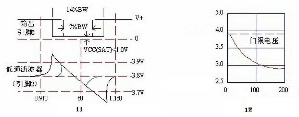 На рисунке 11 показана временная зависимость между выходом контакта 2 и выходом контакта 8 при использовании микросхемы 567 в качестве тонального переключателя. Временная зависимость показана для двух полос пропускания (14% и 7%).