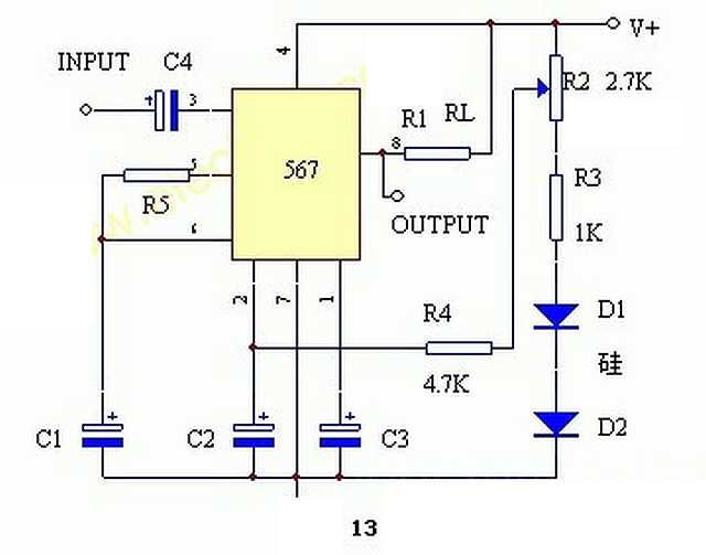 Принцип работы микросхемы 567 аналогичен принципу работы низковольтного силового выключателя. При поступлении входного сигнала в выбранном узком частотном диапазоне выключатель включается. Другими словами, 567 может использоваться как прецизионный регулятор тембра.