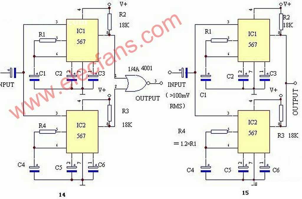 Схема на рисунке 14 функционирует как двухтональный декодер. При наличии любого из двух входных сигналов может быть активирован выходной сигнал. На рисунке два тональных переключателя активируются источником сигнала, а их выходы обрабатываются интегральной микросхемой CD4001B CMOS.
