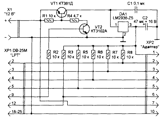 Если по каким-либо причинам подключать программатор к СОМ-порту нежелательно, можно воспользоваться параллельным LPT. Никаких преимуществ это не дает, так как протокол обмена данными остается прежним. Поскольку преобразования уровней не требуется, схема базового блока, подключаемого к порту LPT, очень проста (рис. 4). "Внутреннего" питания она не предусматривает, а узел коммутации внешнего напряжения аналогичен показанному на рис. 2. Прототип этой схемы был опубликован вместе с одной из первых версий программного обеспечения PonyProg. К сожалению, его автор не сообщает, совместимы ли последние версии с подобным блоком. Возможны различия в выборе выводов LPT-порта для формирования и приема тех или иных сигналов.