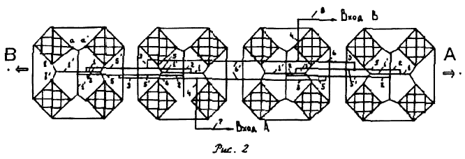 В отличие от выше рассмотренной система питания со входом В обеспечивает фазирование не четырех, а восьми вибраторов. По этой причине она содержит дополнительные линии задержки, роль которых выполняют отрезки 1 и 1, равные 1 м и 3,75 м соответственно. Кроме того, отрезки 1, 5 и 6 линий задержки имеют несколько большую длину, чем отрезки 1', 5х и б1. Они подключаются к поперечным вибраторам, расположенным ближе к точке В. Все отрезки кабелей антенны соединяются друг с другом с помощью высокочастотных разъемов. Это позволяет не только быстро собирать СА, но и путем переключения небольшого числа отрезков системы питания осуществлять поворот максимума ее ДН в нужном направлении. В частности, при взаимной перестановке отрезков 5 и 5', а также 6 и 6'системы питания со входом А максимум ДН меняется на 180". То есть антенна может одновременно обеспечивать две радиосвязи в азимутальном секторе углов, примыкающих к направлению В. Либо осуществить здесь прием с разносом по поляризации при совместном использовании входов А и В. Если же попарно выровнять между собой отрезки 1 и 1\ 5 и 51, 6 и 61, то максимумы ДН будут перпендикулярны оси А-В антенны.
