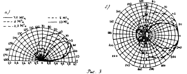 На рис. За и 36 показаны ДН антенны в вертикальной и горизонтальной плоскостях для частот 5 и 10 МГц. Как видно, СА уверенно перекрывает своей ДН сектор углов возвышения 25-60+, под которыми проходят ионосферные волны на трассах средней протяженности. Время развертывания антенны не более 25 мин.