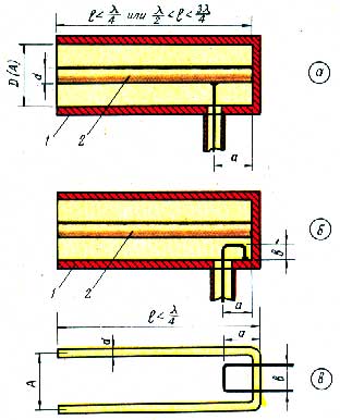 Конструкции резонаторов. В коаксиальном резонаторе (рис. 1, а, б) применяется отрезок экранированной линии, состоящей из полого металлического цилиндра 1 и расположенного по его оси цилиндрического (трубчатого или сплошного) проводника 2. В диапазоне волн l>30 см обычно применяют отрезки линии длиной l<l/4. При волнах короче 30 см чаще применяют отрезки длиной l/2<l<Зl/4.