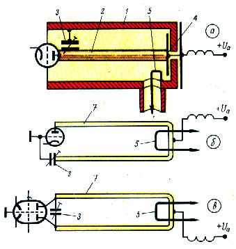 Резонаторы коаксиальной конструкции удобно использовать в ламповых генераторах на триодах с дисковыми выводами электродов. Конструкция подобного генератора схематично показана на рис. 2, а. Внутренний проводник 2, находящийся под положительным потенциалом, должен быть изолирован от внешнего цилиндра 1. Внутренний проводник у короткозамкнутого конца линии отделен от дна внешнего цилиндра тонкой изоляционной прокладкой (обычно из слюды). Полученный таким образом конденсатор 4 замыкает накоротко (для токов СВЧ) внешний и внутренний проводники резонатора.