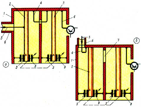 Связь резонатора с другими контурами и цепями часто осуществляют индуктивным способом - с помощью витка (петли) связи, расположенного у короткозамкнутого конца резонатора. В полосовых фильтрах приемников резонаторы можно связывать между собой при помощи витка 4 (рис. 3, а) либо щели 7 в общей стенке (рис. 3, б). Связь усиливается с увеличением размеров витка и щели.