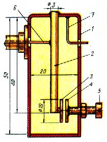 Рис. 8. Схема резонатора с основными размерами (пример).Здесь: 1 - внешний проводник резонатора; 2 - внутренний проводник; 3 - неподвижная обкладка подстроечного конденсатора; 4 - подвижный диск подстроечного конденсатора; 5 - винт установки емкости конденсатора; 6 - проводник кондуктивной связи с коаксиальным кабелем; 7 - виток индуктивной связи.